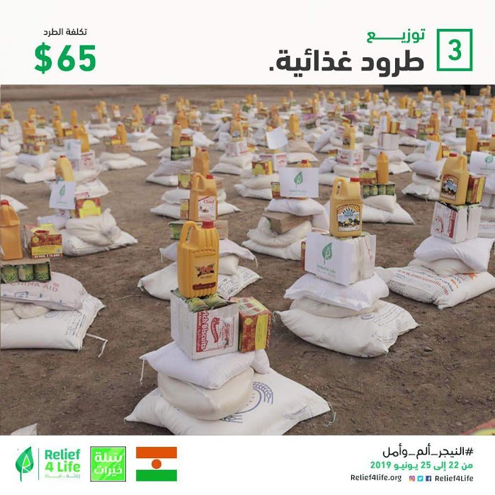 2. توزيع طرود غذائية بتكلفة 65 دولار للطرد يكفي أسرة مترسطة لمدة 15 يوم.