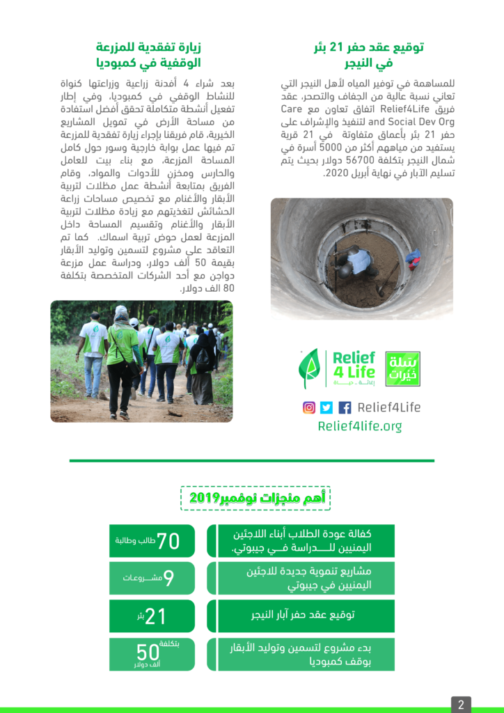 للمساهمة في توفير المياه لأهل النيجر التي تعاني نسبة عالية من الجفاف والتصحر، عقد فريق Relief4Life اتفاق تعاون مع Care and Social Dev Orgلتنفيذ والإشراف على حفر 21 بئر بأعماق متفاوتة في 21 قرية يستفيد من مياههم أكثر من 5000 أسرة في شمال النيجر بتكلفة 56700 دولار بحيث يتم تسليم الآبار في نهاية أبريل 2020.