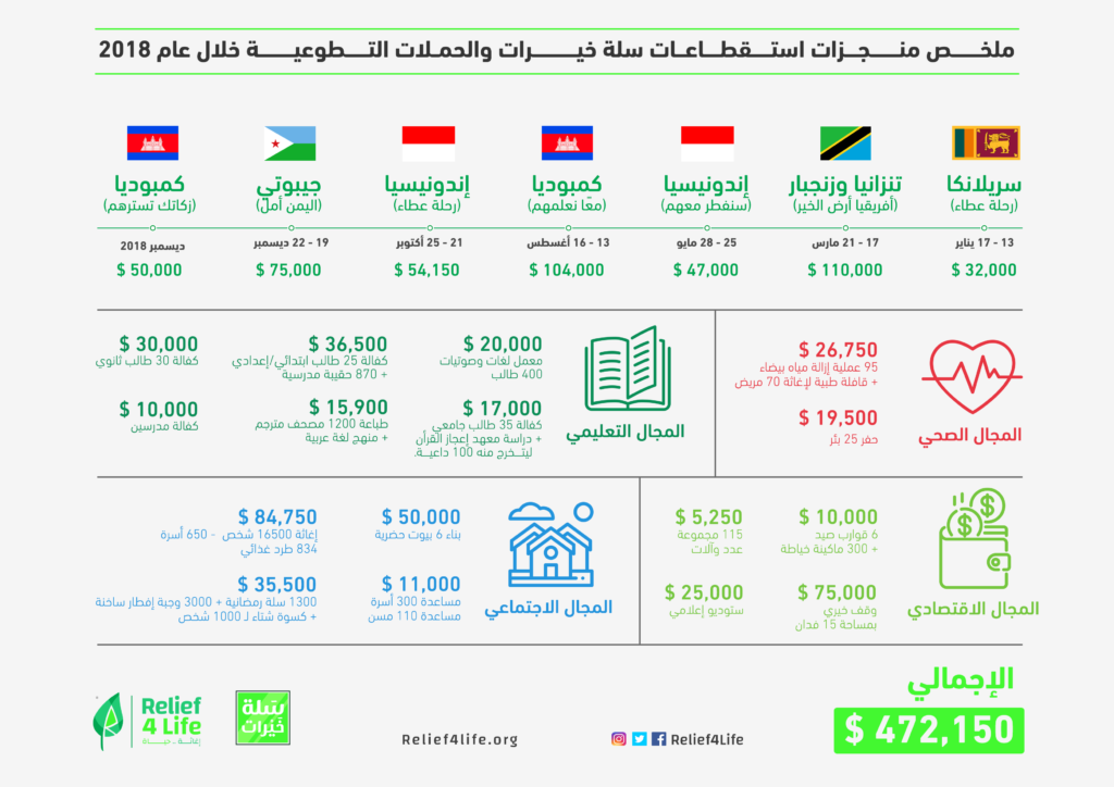 حصاد ٢٠١٨ حصاد عام ٢٠١٨ انفوجرافيك يوضح ملخص استقطاعات سلة خيرات والحملات التطوعية خلال عام ٢٠١٨ سريلانكا – تنزانيا ونجياز – إندونيسيا – كمبوديا – جيبوتي 0 تقرير شهر يناير ٢٠٢٠ خبيب يشارك بمسابقات التأهيل التحضيرية لمسابقة تيجان للقرآن الكريم في قطر في رحلة تميز جديدة للطالب الماليزي محمد خبيب،... تقرير شهر يناير ٢٠٢٠ اقرأ المزيد حصاد عام ٢٠١٩ انفوجرافيك يوضح ملخص استقطاعات سلة خيرات والحملات التطوعية خلال عام ٢٠١٩ إندونيسيا – النيجر – جيبوتي – الأردن... حصاد عام ٢٠١٩ اقرأ المزيد تقرير شهر ديسمبر ٢٠١٩ ملخص تقرير عن شهر نوفمبر ٢٠١٩ نشاط صيفي متكامل في مدرسة طلاب الروهينجا لحرص مؤسسة Relief4life على بناء جيل مؤهل من... تقرير شهر ديسمبر ٢٠١٩ اقرأ المزيد