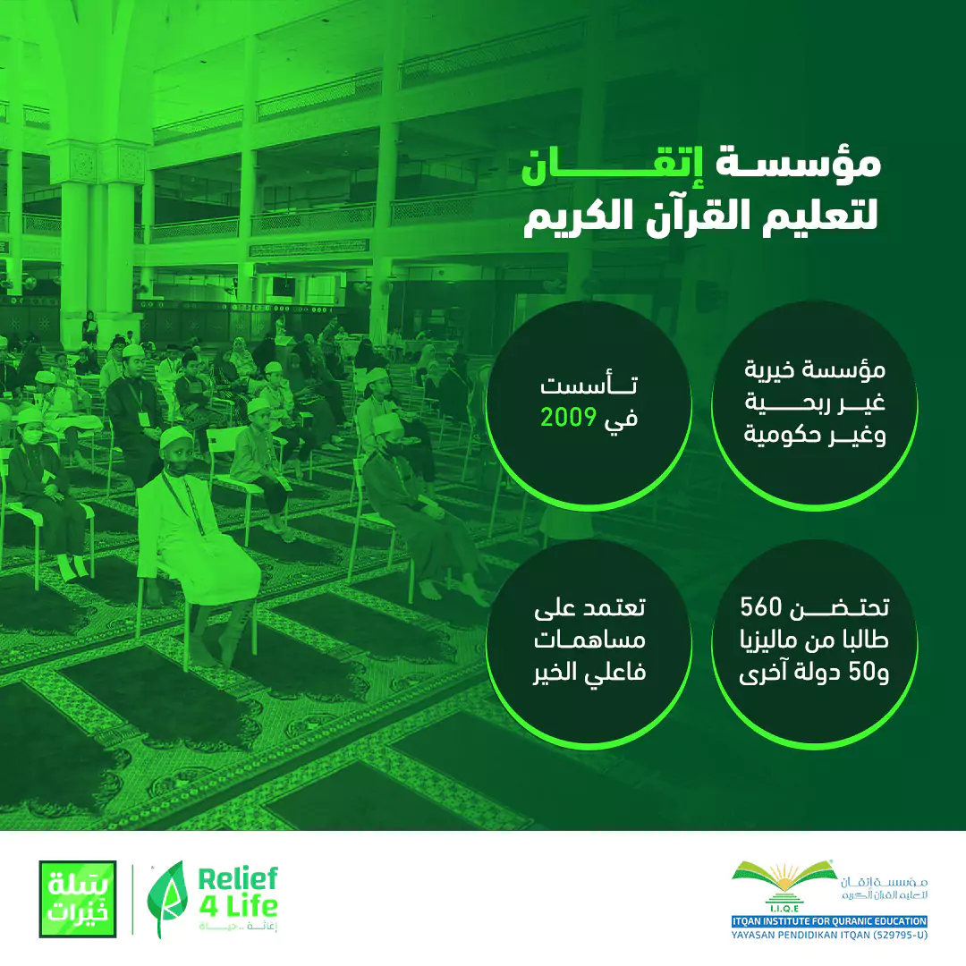 مؤسسة إتقان هي مؤسسة عالمية خيرية تتخصص في تحفيظ كتاب الله والعناية بعلومه وحفظ رواياته وأسانيده.  تأسست مؤسسة إتقان بماليزيا عام 2009، وتحتضن في حلقاتها وقاعات دروسها 560 طالبا من ماليزيا من أكثر من خمسين دولة عربية وغير عربية غيرها. تعتمد المؤسسة في كل أنشطتها على تبرعات فاعلي الخير وبذلهم طوال شهور العام.
